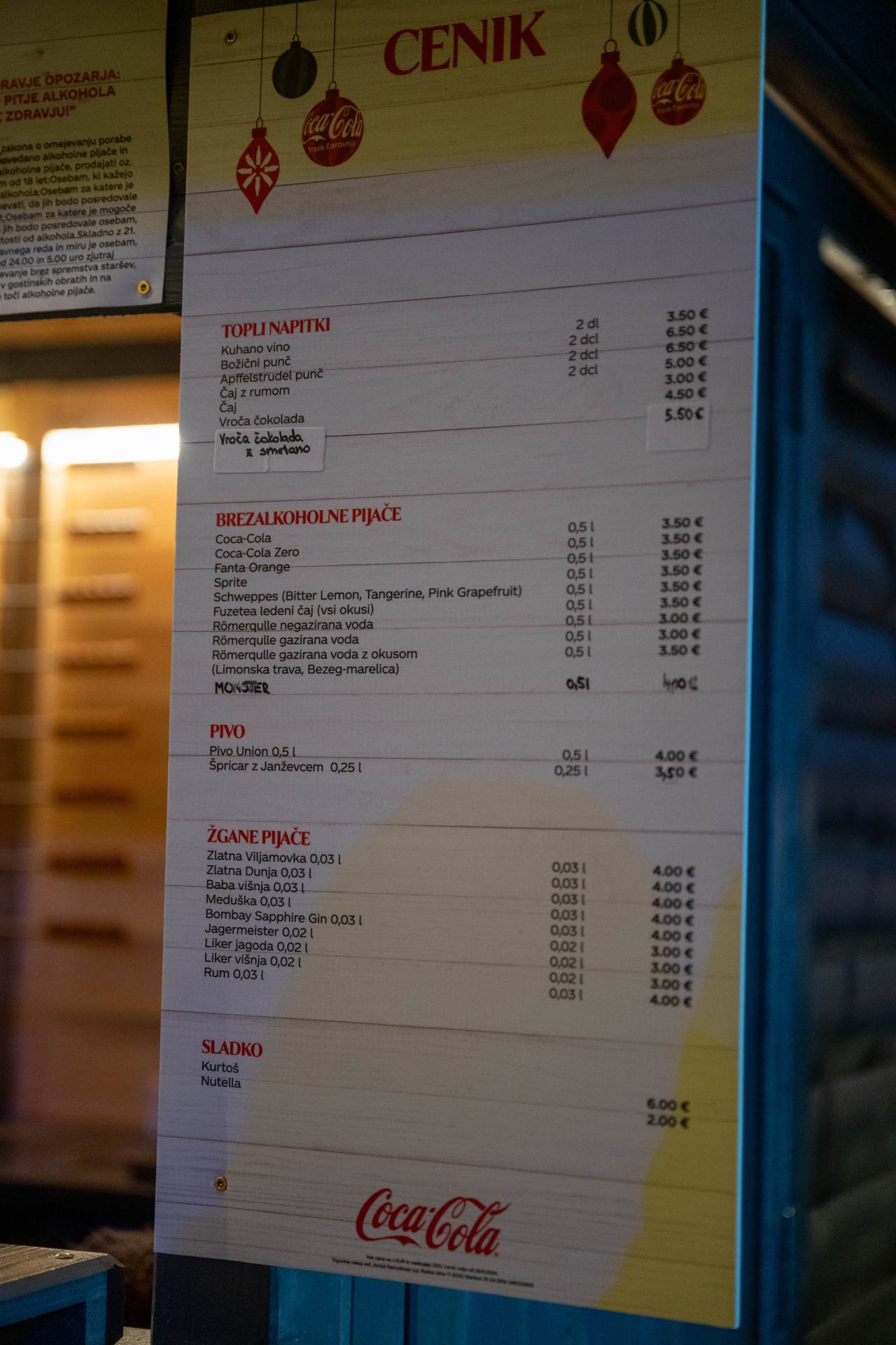 Na Trgu Leona Štuklja je cena za dva decilitra tri evre, za tri pa štiri evre. Dražje je kuhano vino na Glavnem trgu; za dva decilitra bosta odšteli 3,5 evra, za tri decilitre pa 4,5. Čaj stane 3,5 evra.