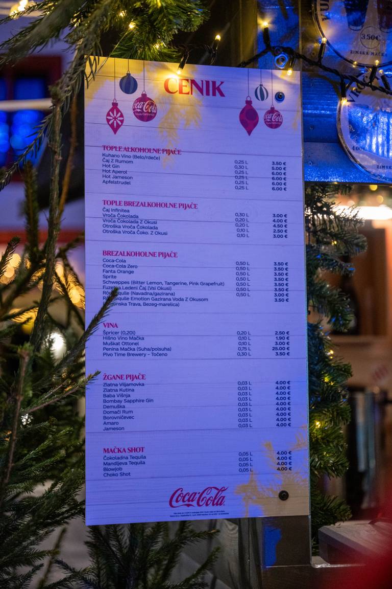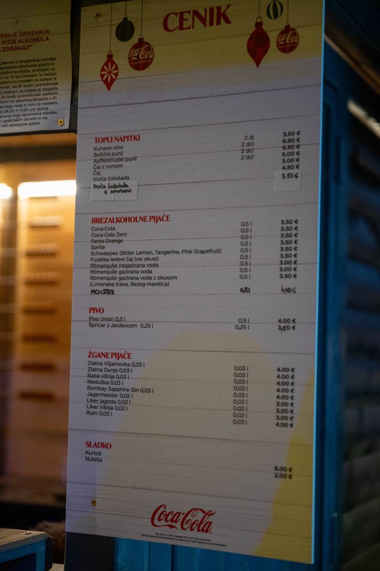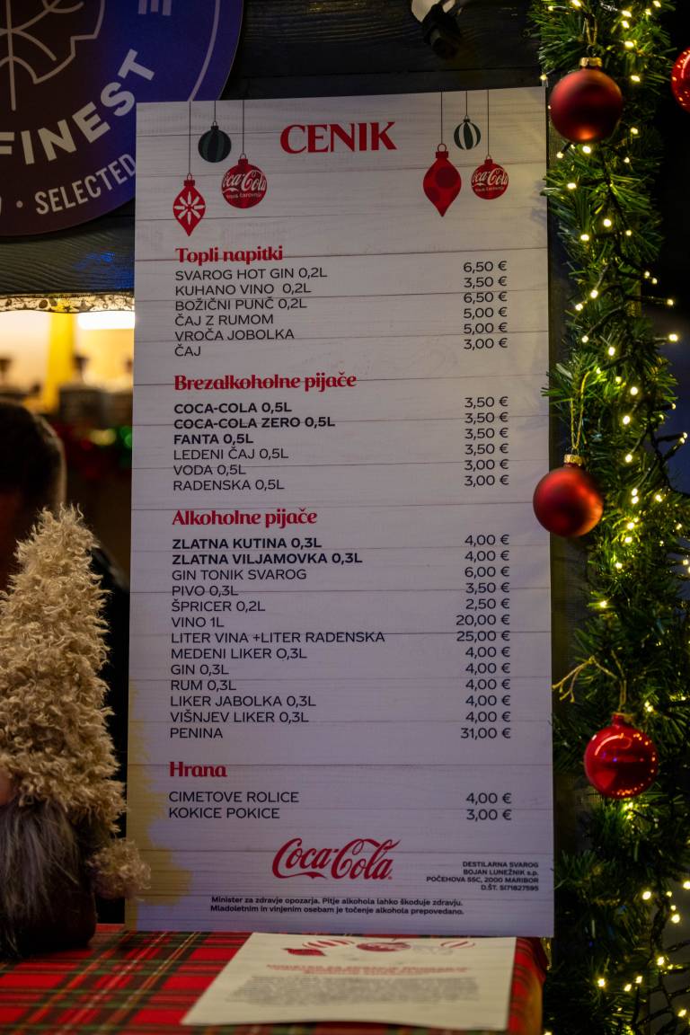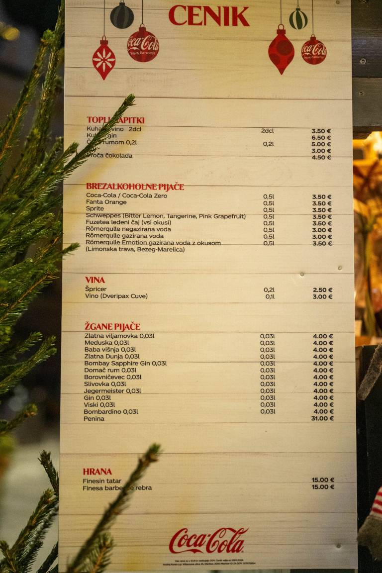 Tamkajšnji adventni sejem sicer vsako leto privabi tudi veliko Mariborčanov. Klobasice stanejo sedem evrov, hrenovke štiri evre. Sladki prigrizki, kot so fritule, so od pet do enajst evrov. Palačinke so šest evrov, burgerji celo 20 evrov. Kozarček kuhanega vina je 3,5 evrov, otroški čaj pa dva evra.