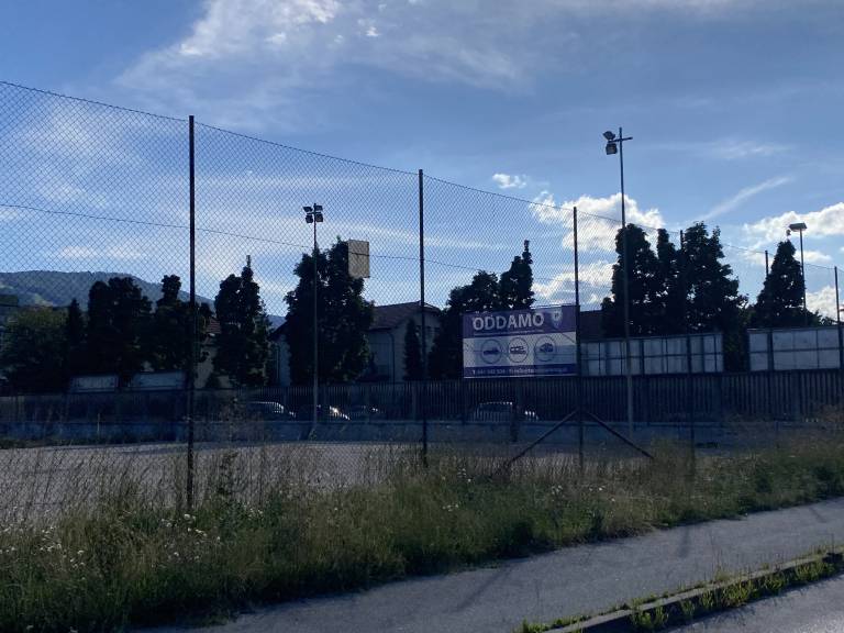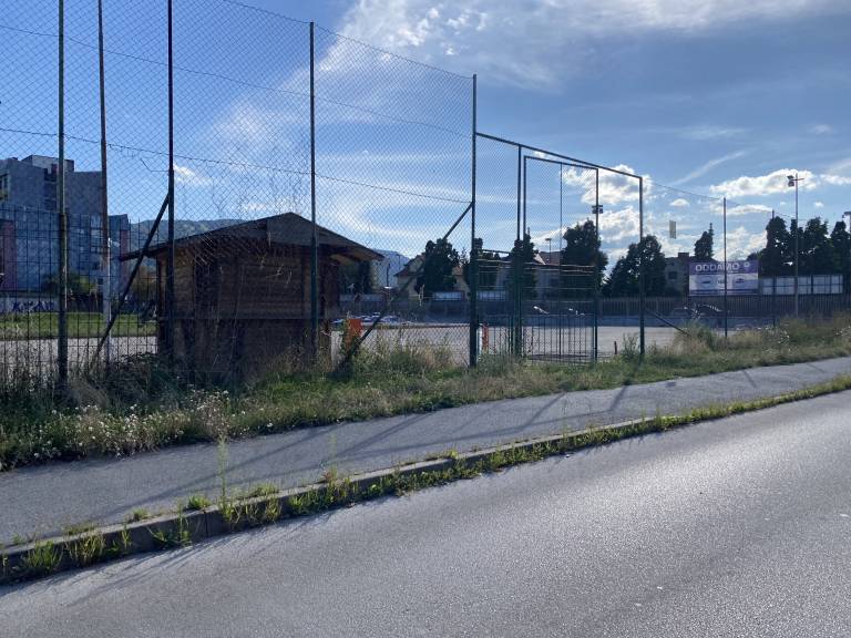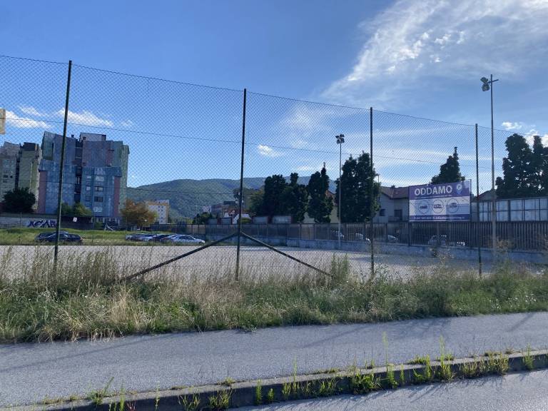 Igrišče je postalo poslovni prostor, ki ga na zunanji strani obrašča visoka trava.