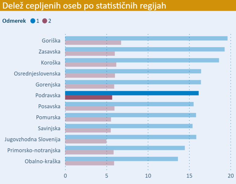 V Podravju je bilo s prvim odmerkom cepljenih 16,15 odstotka prebivalcev oziroma 52.743 ljudi, z drugim pa le 5,69 odstotka prebivalcev oziroma 18.569 ljudi.