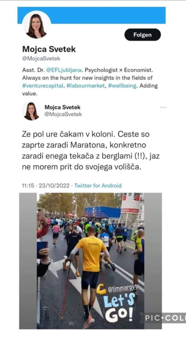 »Že pol ure čakam v koloni. Ceste so zaprte zaradi maratona, konkretno zaradi tekača z berglami (!!), jaz ne morem priti do volišča,« je prejšnjo nedeljo na Twitterju zapisala asistentka na ljubljanski ekonomski fakulteti. Besedilu pa dodala fotografijo, na kateri je tekač, ki je po njenem mnenju kriv za to, da ne more na volišče.