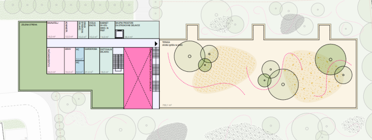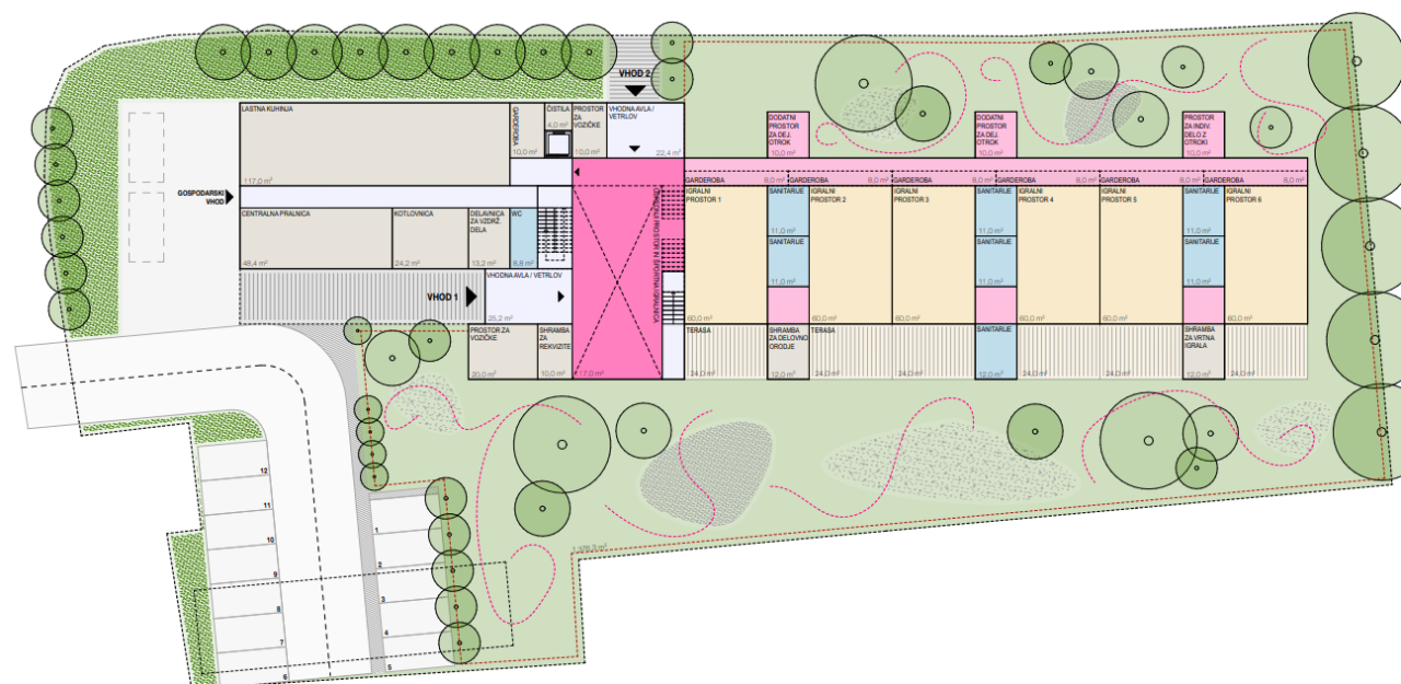 Trinadstropni vrtec, zelene površine in igrišče za otroke