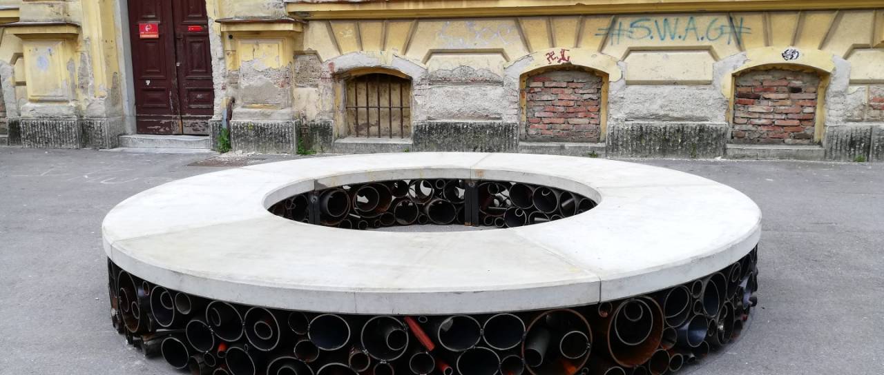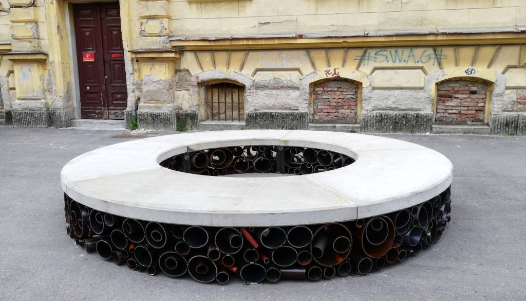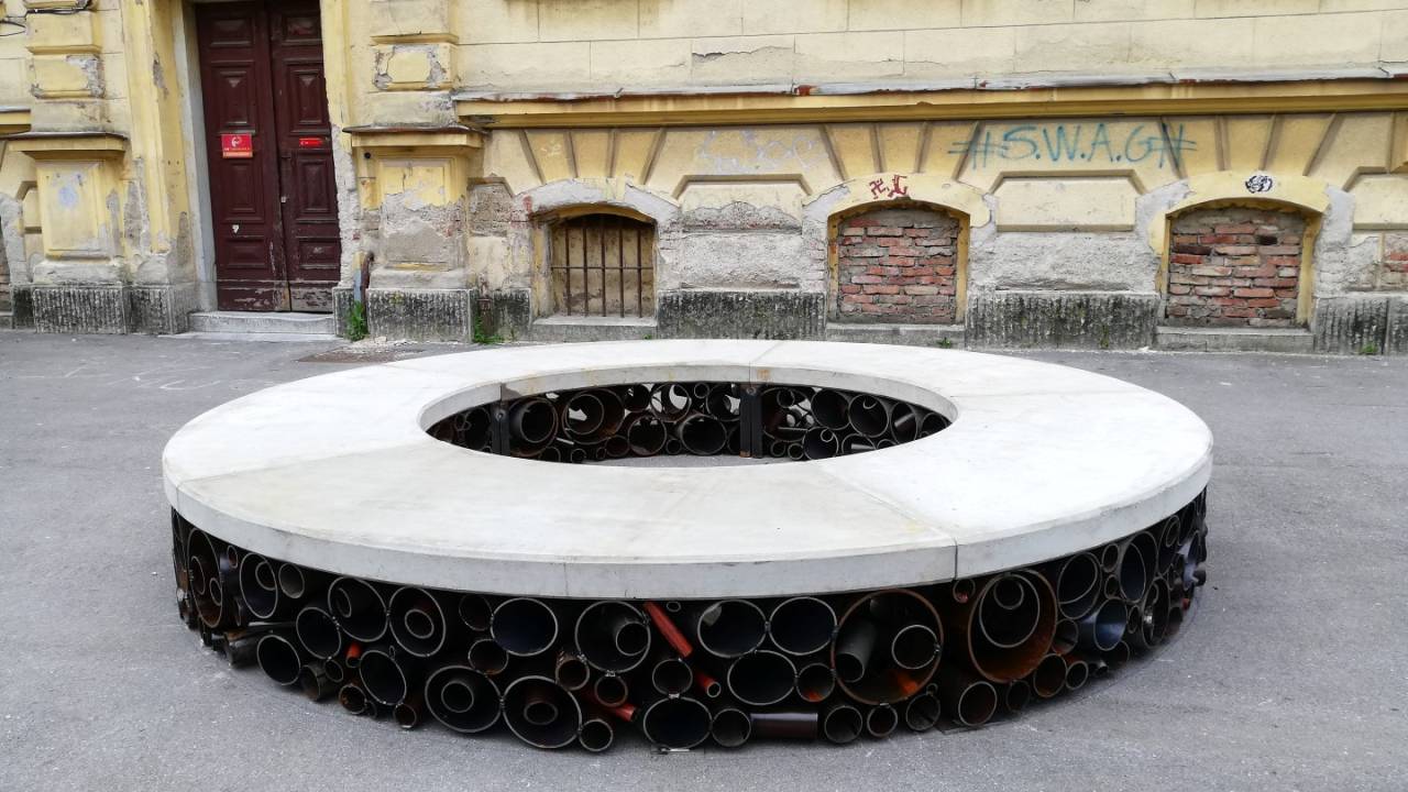 Umetniška klop se odziva na stavbo in njeno zgodbo. Njena forma ni naključje. Ponazarja težko zgodovinsko vsebino in žalostno propadanje stavbe ter obenem začetek njenega preporoda.