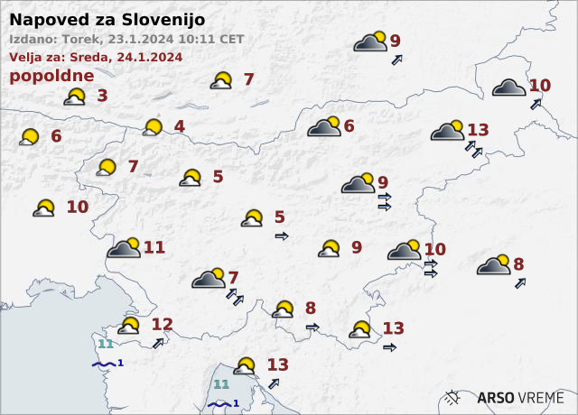 V sredo bo nato zmerno do pretežno oblačno, zjutraj bo po nižinah nekaj megle. Najnižje jutranje temperature bodo od minus sedem do minus ena, ob morju dve, najvišje dnevne pa od štiri do 13 stopinj Celzija.