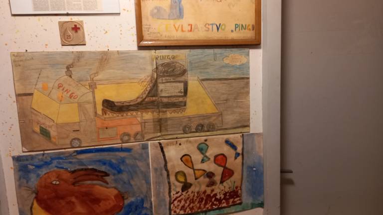 Na stenah visijo starine in otroške risbice s čevljarji. Ob steni sta stroj za izdelovanje čevljev in šivalni stroj Adler. Na policah pa čevlji.