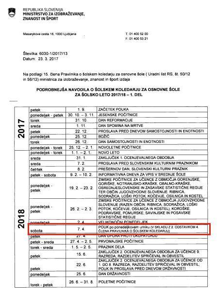 »To je bilo že prej predvideno v letnem delovnem načrtu, ne glede na stavko bi bila delovna sobota,« pojasnjujejo v PR službi ministrstva in dodajajo: »Po letnem delovnem načrtu mora biti določeno število dni pouka v letu, ker pa so prazniki in počitnice letos porazdeljeni tako, da bi bilo teh manj kot sicer, morajo en dan nadomeščati – in to je ta sobota.«
