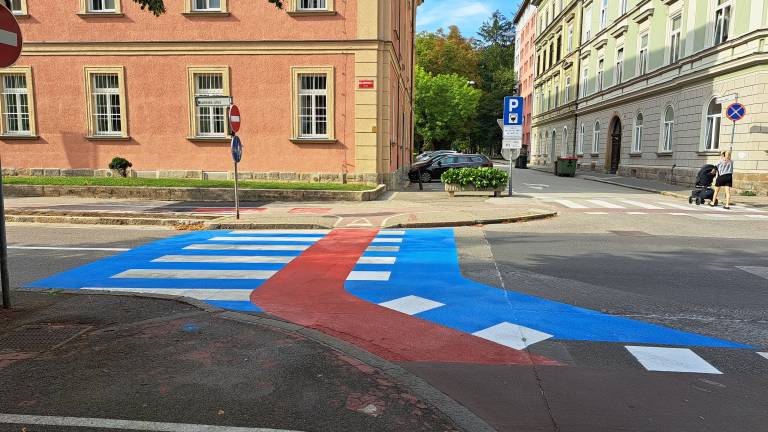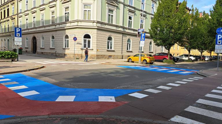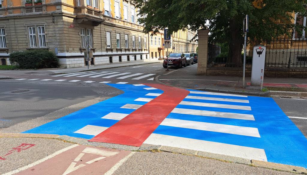 Na Maistrovi ulici v Mariboru so pred dnevi delavci na novo urejali prehod za pešce. Prehod so prebarvali na modro, tako zebra kot pas za kolesarje pa zavijeta v ovinek. Modro je pobarvan tudi bližnji prehod na drugi strani križišča.