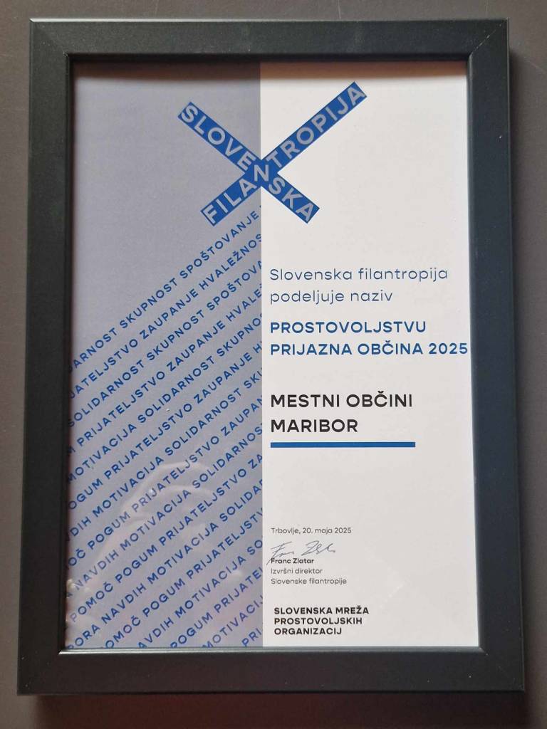 »Z veseljem in ponosom smo prevzeli priznanje Slovenske filantropije - Prostovoljstvu prijazna občina 2025,« so sporočili iz Mestne občine Maribor.