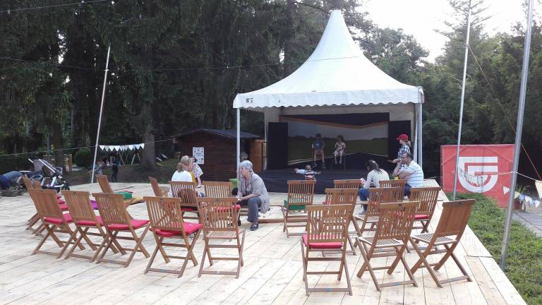 Zaradi slabega vremena in dopoldanskih ploh jutranji program s Kiblo v sodelovanju z Art Kampom odpadel. Popoldanskemu delu programa pa se je pridružil sonce. Druženje je navdihovala vsebina razstave v razstavišču KiBela, umetnice Duše Jesih, ki ustvarja v slikarskem mediju. Na delavnici so ljudje spoznali njen način slikanja z geometrijskimi oblikami in se z njimi tudi igrali.