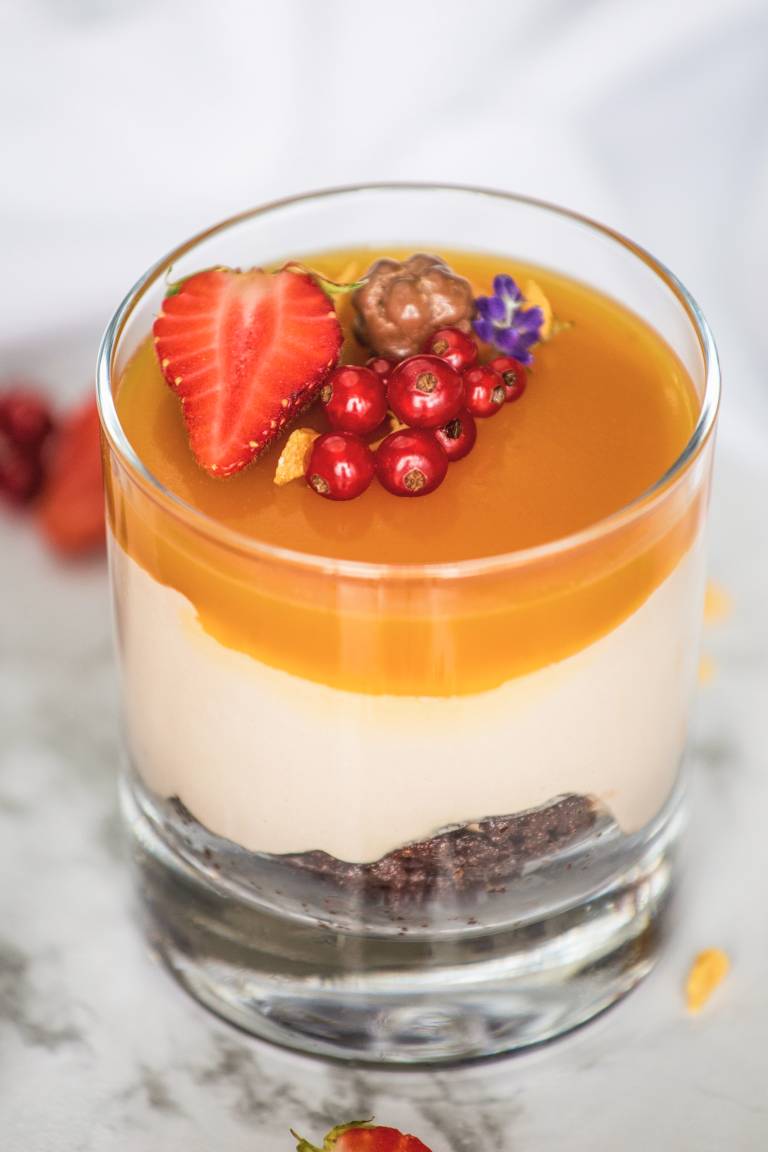 Temna belgijska čokolada je posipana s kakavovimi zrni, liofiliziranim sadjem, oreščki.