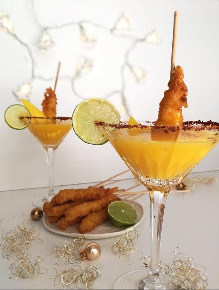 Hrustljave kozice lahko namakate v mangovem koktejlu, lahko jih grizljate in gin z mangovim pirejem popijete kar tako. Kozarec lahko okrasite tako, da ga namočite v limetin sok ali ga povaljate v sladkorju z limonino lupinico. Recept je na voljo tukaj.