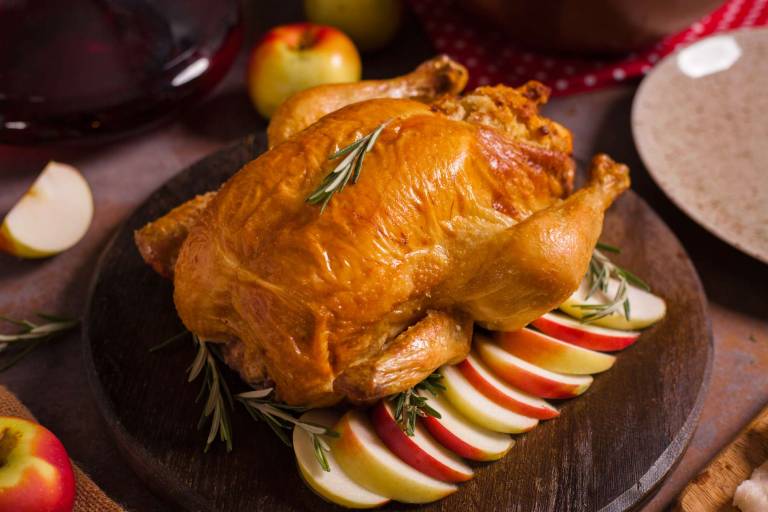 Odličen pečen piščanec s hrustljavo skorjico bo lepa pika na i na vaši praznični mizi. Potrebovali boste celega piščanca, kruh, jajca, smetano za kuhanje, maslo, čebulo, jabolko, sladkor, sol, poper in svež rožmarin. Slasten recept je na voljo na tej pletni povezavi.