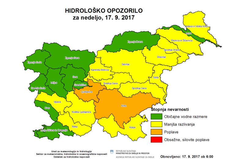 Agencija Republike Slovenije za okolje je včeraj opozorila na morebitno naraščanje vodotokov in možno razlivanje posameznih rek, saj je od petka in do danes zjutraj ponekod padlo tudi 130 litrov dežja na kvadratni meter.