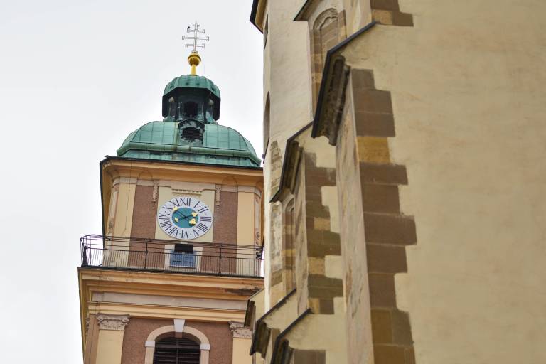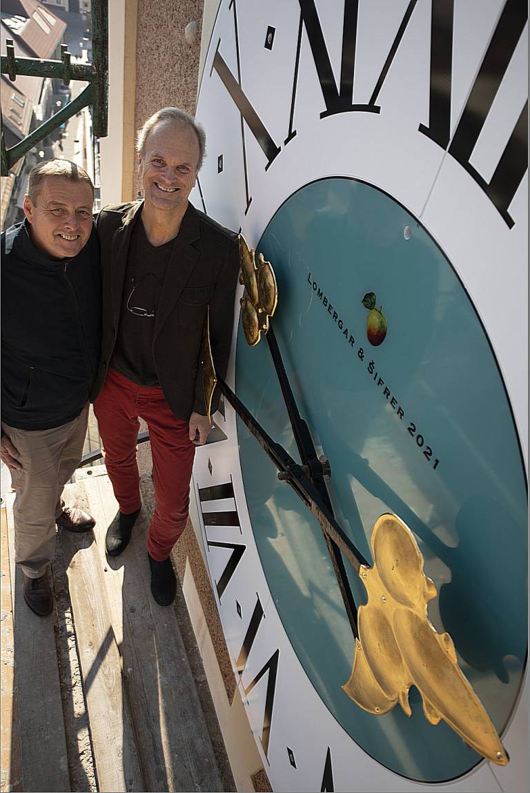 Na zvoniku mariborske stolnice se lesketa nov nakit. Aleš Lombergar in Gorazd Šifrer, ki sta lani rekonstruirala številčnico ure na Prvi gimnaziji, sta zdaj uredila vse štiri številčnice na zvoniku stolnice ter jim vrnila rimske številke in zlate kazalce.
