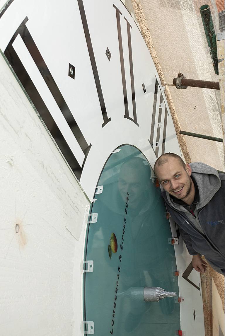 Še preden so na zvonik namestili nove številčnice, so pripravili maketo, s katero so preverili, kako grafična podoba številčnice izgleda v naravni svetlobi. Vsega na računalniškem zaslonu namreč ni mogoče predvideti.