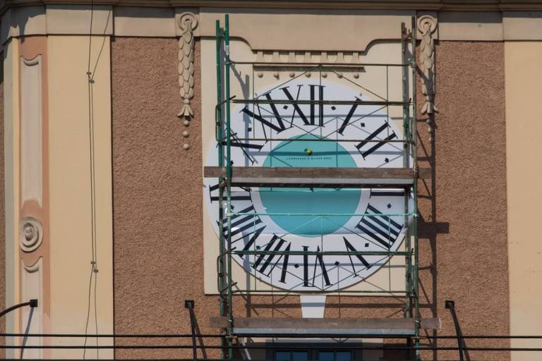 6. decembra so odstranili tudi gradbene odre in od tedaj imajo mimoidoči neoviran pogled na številčnice s sinje modrim krogom in zlatimi kazalci.