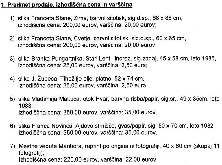 Do 12. julija je moč oddati ponudbo za sedem umetnin, katerih izklicne cene so na predhodni prodaji dosegale od 50 do 700 evrov, sedaj pa od 25 do 350 evrov.