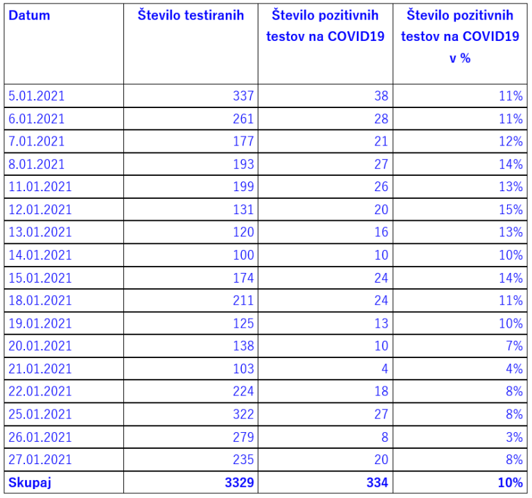 Skupno so v času od 5. januarja do 27. januarja v Mariborskem zdravstvenem domu testirali 3329 ljudi, od tega je bilo 334 ljudi pozitivnih na okužbo s koronavirusom. To pomeni, da je bil delež pozitivnih 10-odstoten.
