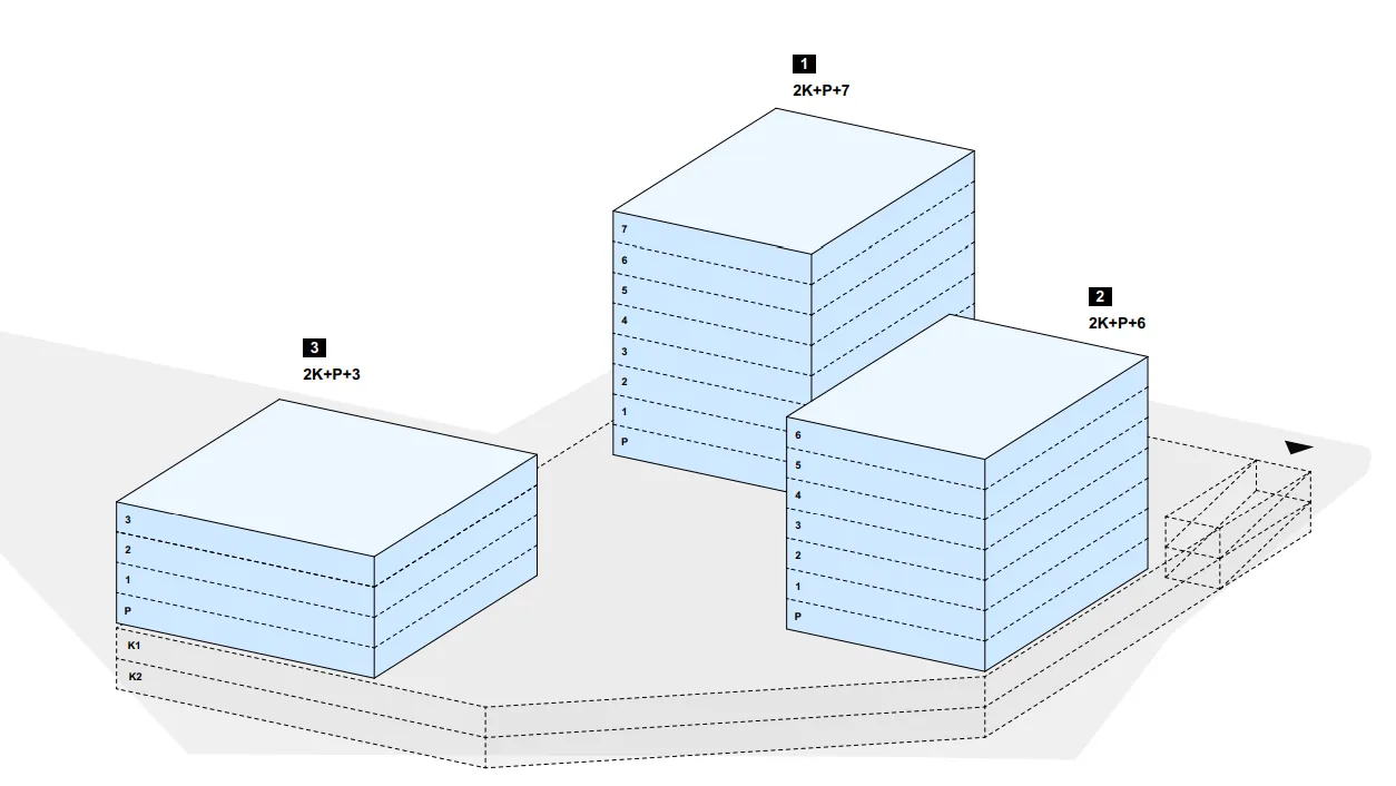 Tako naj bi prvi objekt zraven dveh kletnih etaž in pritličja obsegal še sedem nadstropij, drugi šest nadstropij, tretji pa zraven pritličja in kleti še tri nadstropja. Objekti naj bi imeli ravno streho, s čimer načrtujejo postavitev zelene pohodne strehe.