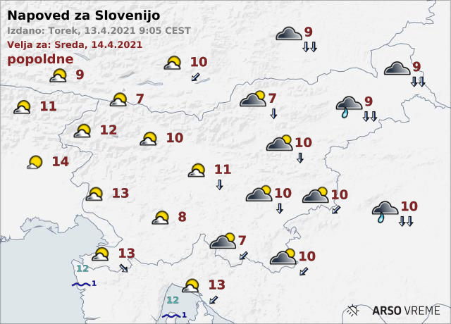 V sredo bo v zahodnih krajih delno jasno, drugod bo spremenljivo do pretežno oblačno, več oblačnosti bo na severovzhodu. Ponekod bo pihal severni veter.