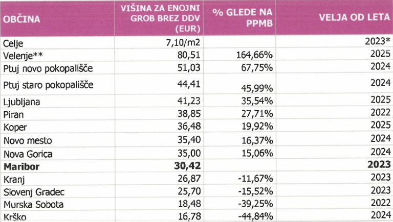 Povprečna cena grobnine v mestnih občinah po podatkih mariborskega pogrebnega podjetja znaša 37 evrov, v Mariboru 30,42 evra.