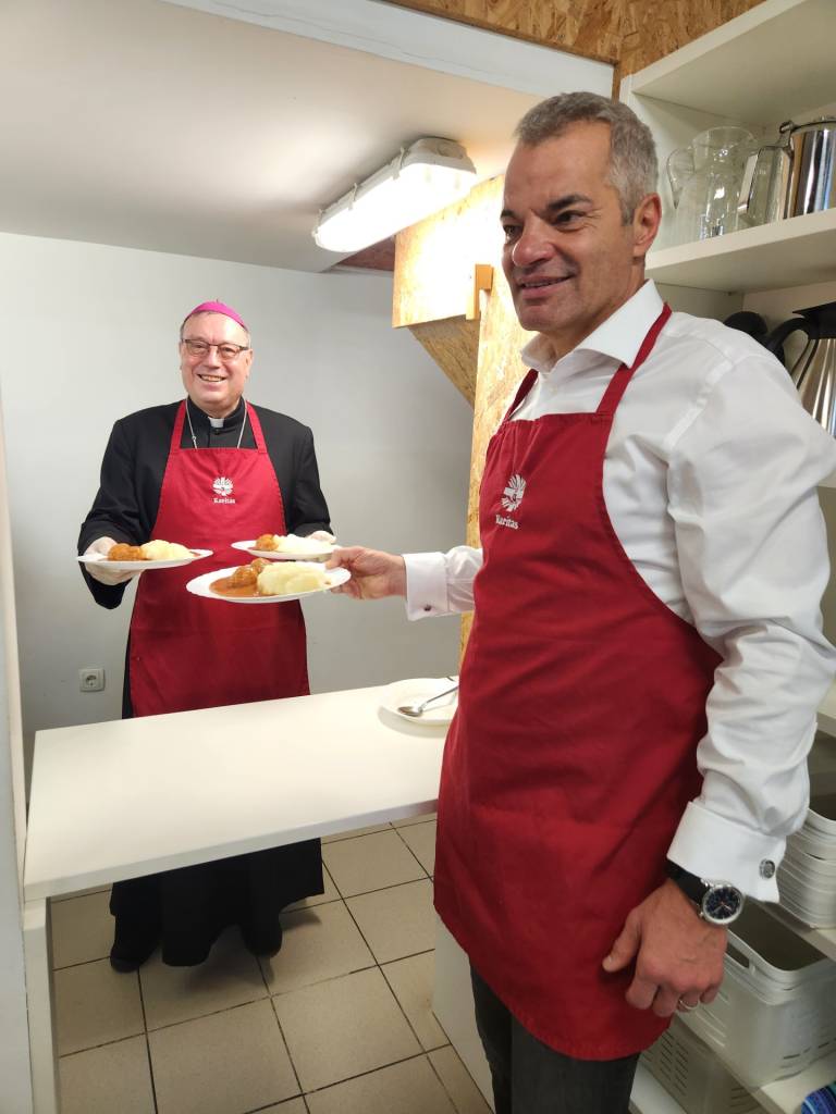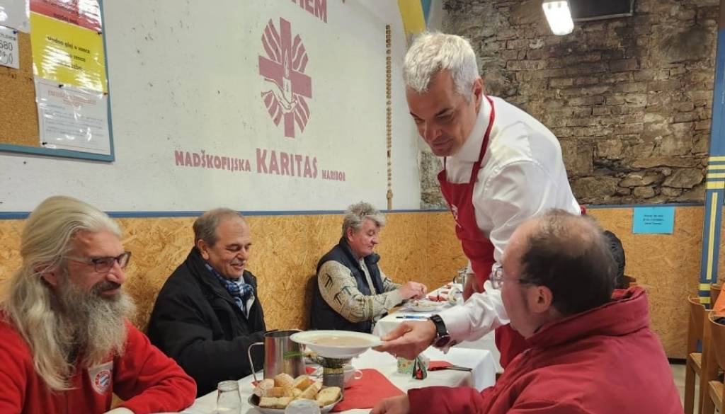 Nadškof in župan sta si opasala predpasnike, zavihala rokave in se pridružila prostovoljcem pri razdeljevanju kosil. S pristnim veseljem in prijaznimi besedami sta vsakemu izmed prejemnikov vlila občutek, da ni sam v svoji stiski.