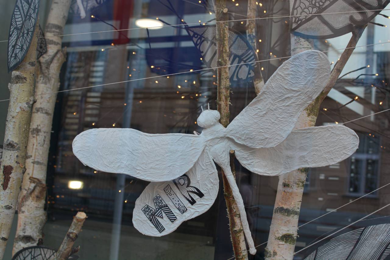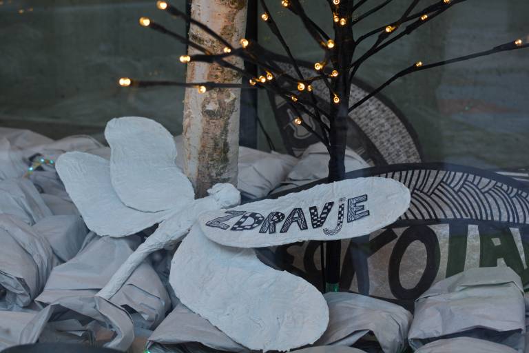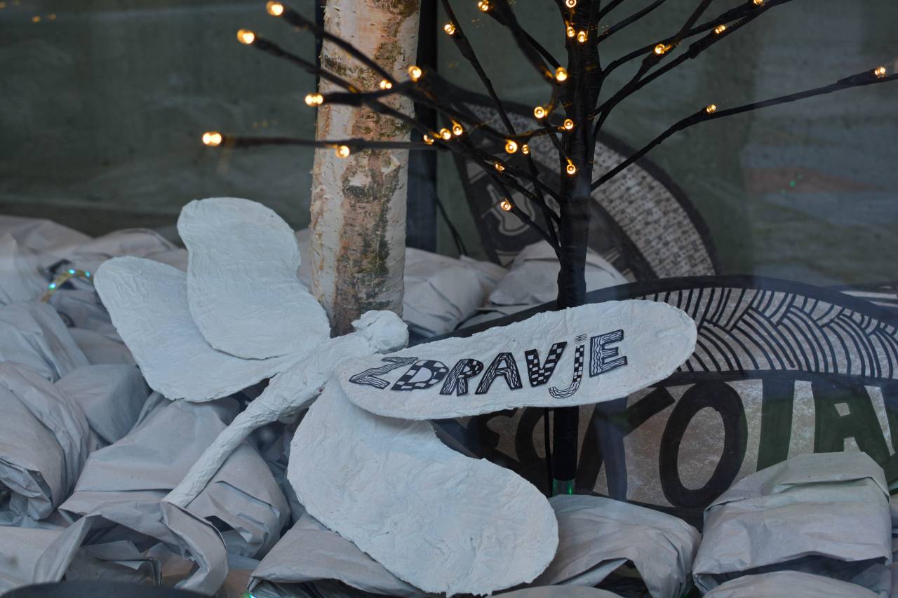 Pred vhodom v Srednjo šolo za trženje in dizajn Maribor izložbo krasi zimska vila, na metuljevih krilih in listih so zapisane dobre želje, ki si jih v novem letu želijo dijaki.