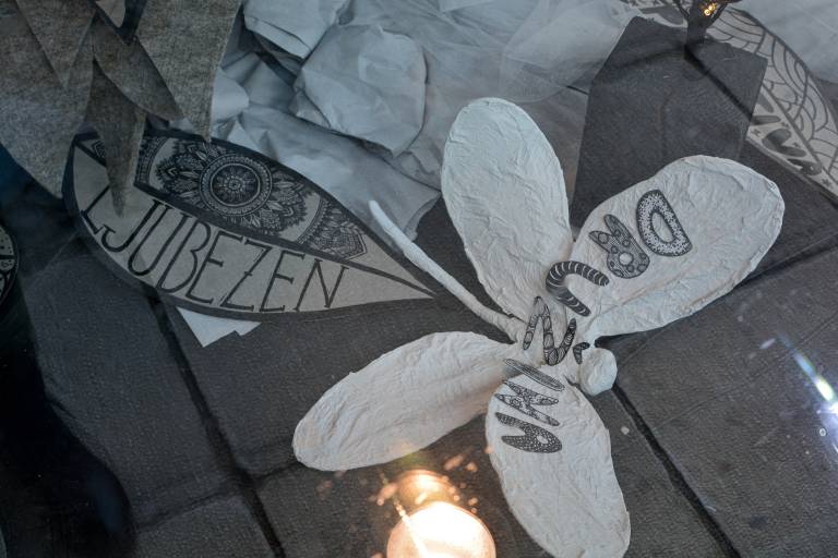 Kaj si dijaki najbolj želijo? Na listih in metuljevih krilih najdemo želje, kot so 'ljubezen, mir, zdravje, družina, sanje, povezanost, nasmeh'.