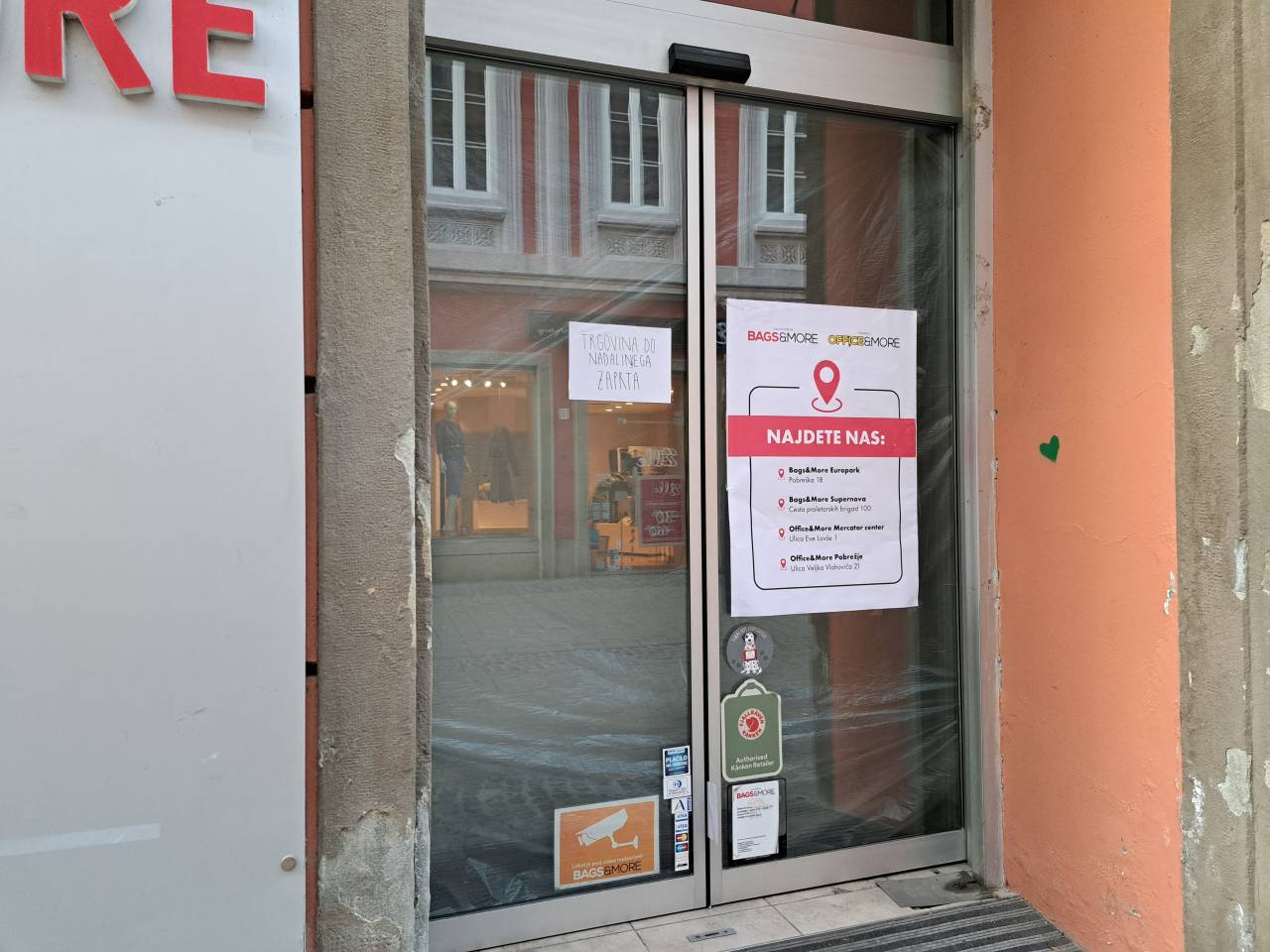 Mimoidoče na Jurčičevi ulici pričakajo prelepljene izložbe trgovine Bags&More. »Trgovina do nadaljnjega zaprta,« piše na vratih.