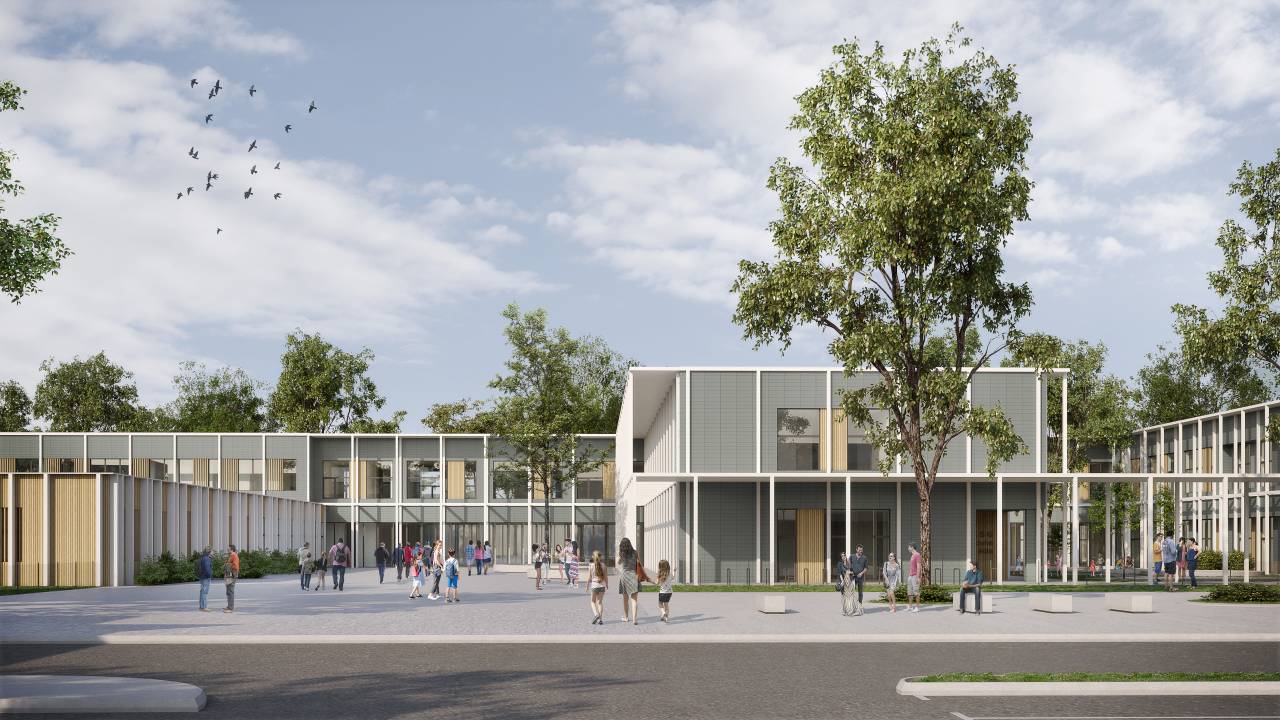 Novogradnja športne dvorane srednjih šol pa je predvidena v skupni izmeri 2.378 m2 neto notranjih površin. Zasnova vključuje tudi ureditev zunanjih površin območja, med drugim skupne športne, parkovne in prometne površine, vhodne ploščadi ter šolska dvorišča.