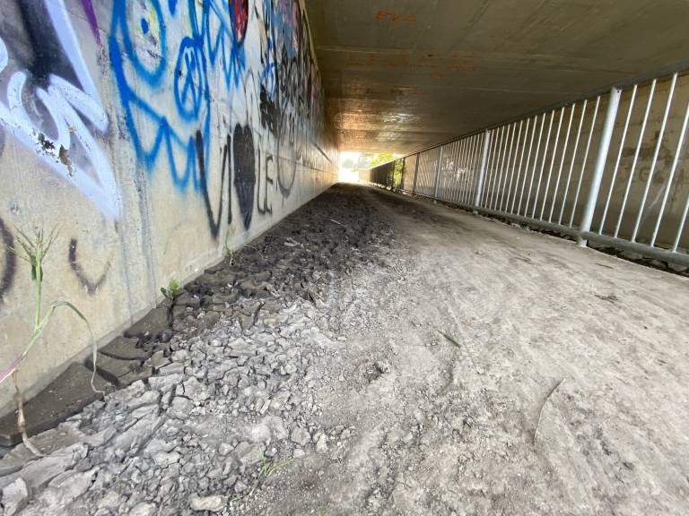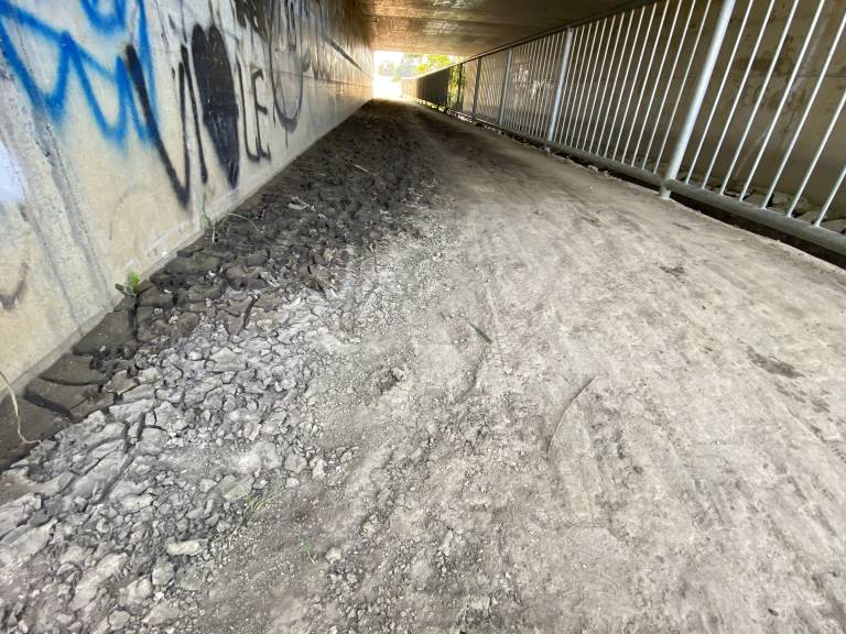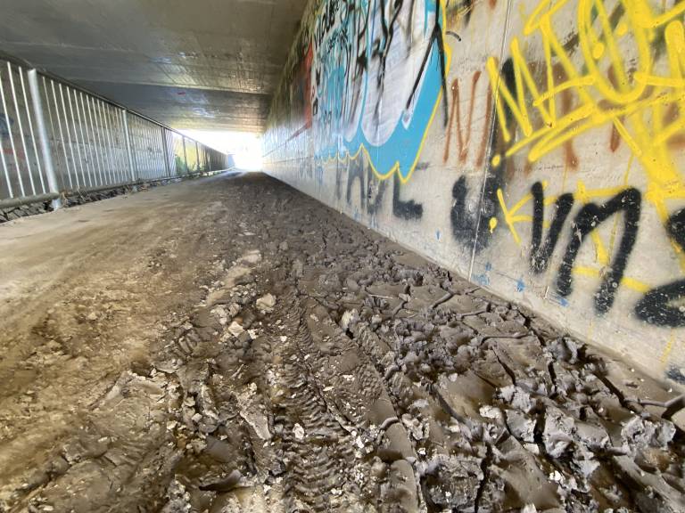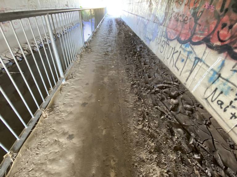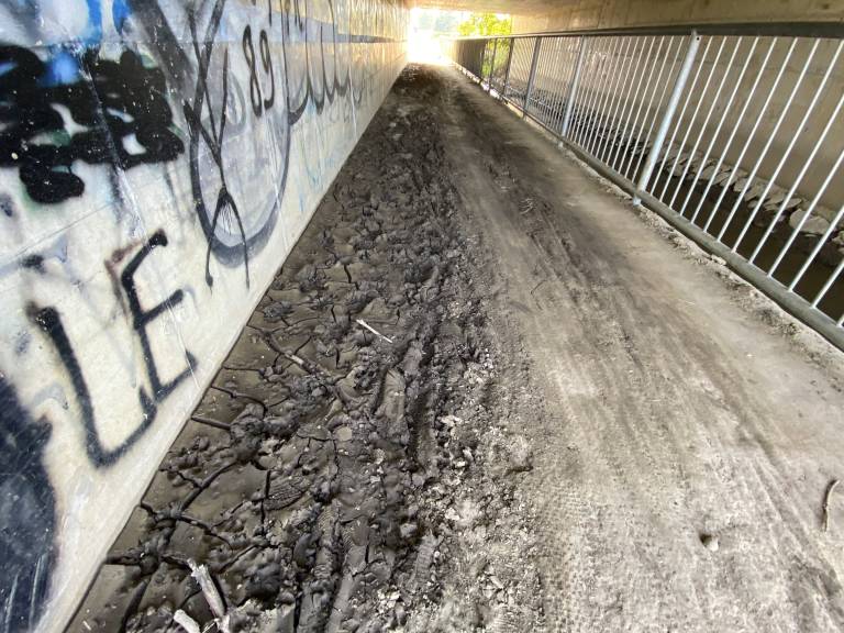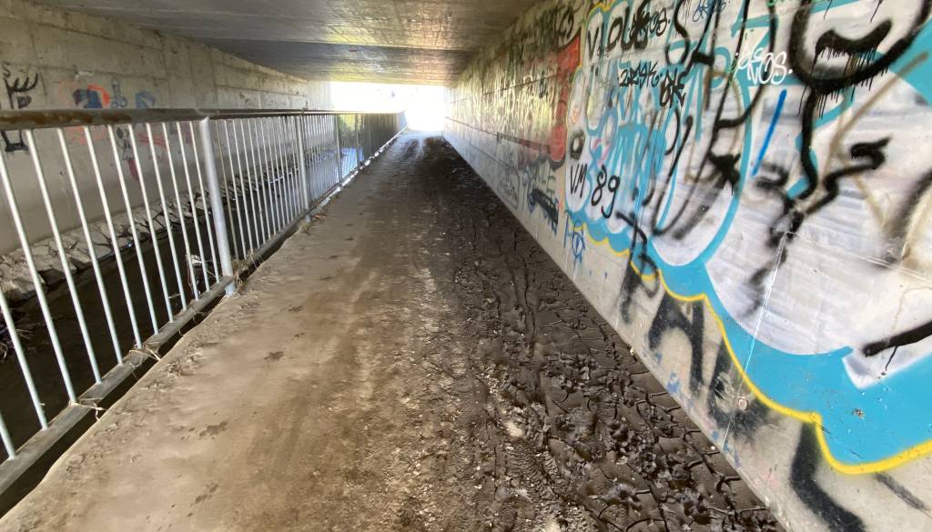 In res, kot smo se prepričali tudi sami, je podhod poln blata, na mestih ga je tudi več centimetrov. Ob obeh vhodih je blato posušeno, na sredini pa mokro in spolzko.