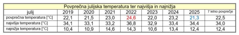 Iz tabele 1 je razvidno, da je bil letošnji julij, s povprečno temperature 21,3 stopinj Celzija, najhladnejši v zadnjih sedmih letih, kljub temu, da je bila julija letos izmerjena druga najvišja temperatura (34,4 stopinje Celzija) v zadnjih sedmih letih.