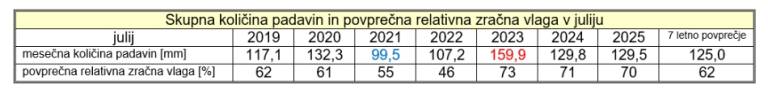 Letošnja relativna zračna vlaga je bila precej nad sedem letnim julijskim povprečjem. Gostota moči sončnega sevanja pa je bila najnižja v zadnjih treh letnih.