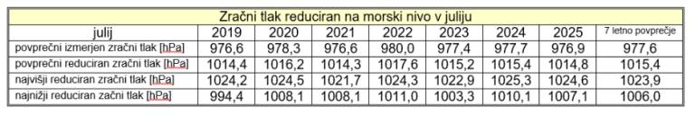 Letošnja povprečna hitrost in sunki vetra, ter zračni tlak so bili okrog sedem letnega julijskega povprečja.