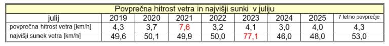 Iz tabele 5 je razvidno, da je bila v juliju 2025 povprečna hitrost vetra 4,0 kilometre na uro, kar je četrta najvišja povprečna hitrost v sedmih julijih. Letos julija je prevladoval jugo-jugozahodni veter.
