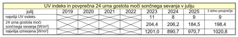 UV indeks je bil julija 2025 ob najvišji izmerjeni gostota moči sončnega sevanja (970,9 W/m2) devet. Rekordni UV indeks pa je bil izmerjen julija 2023, ko je bil ob 1201,0 W/m2 kar 11.