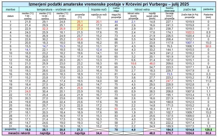 Amaterska vremenska postaja v Krčevini pri Vurbergu, ki leži v celinskem podnebju severovzhodne Slovenije, blizu Ptuja, Maribora, Lenarta in Slovenske Bistrice, je julija 2025 zabeležila en vročinski val, eno tropska noč in devet vročih dni, ko se je temperatura dvignila nad 30 stopinj Celzija, kar je manj kot v rekordnih julijih 2022 in 2024.