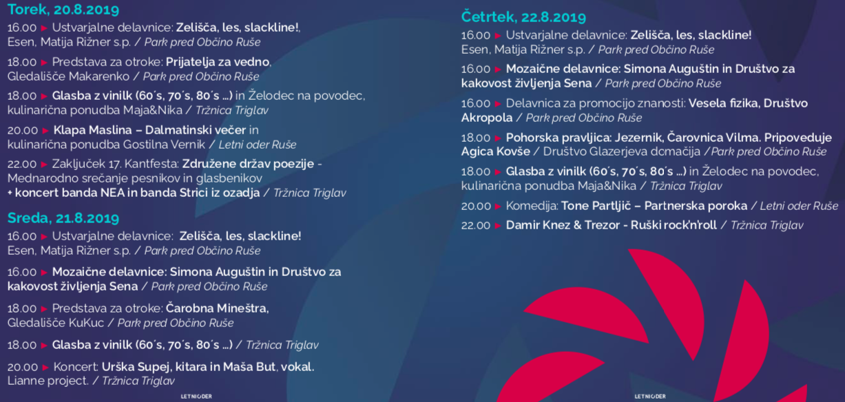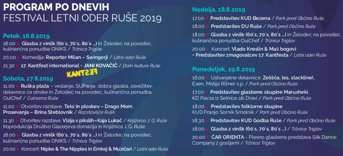 Tokrat 20. jubilejni festival Letni oder Ruše tradicionalno ponuja široko paleto dogodkov: koncerte, delavnice, razstave, ulično gledališče, večerne družabne dogodke, kulinarične ponudbe in gledališke predstave.