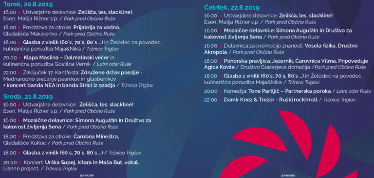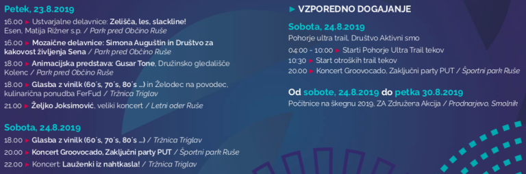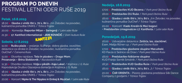 Festival Letni oder Ruše, ki traja od 16. do 25 avgusta, obiskovalce in obiskovalke iz cele Slovenije navdušuje s pestrim programom. Zaključek poletnih počitnic na Štajerskem torej popestri festival, ki vključuje gledališke predstave, koncerte, športne prireditve in prireditve za otroke.