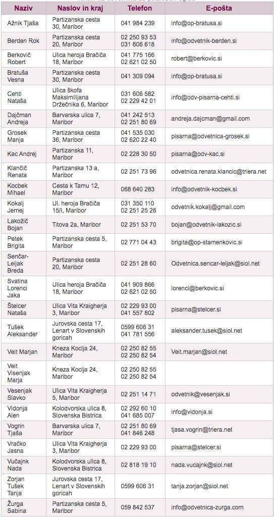 Brezplačno pravno pomoč bo nudilo tudi 26 odvetnikov s sedežem v Mariboru, ki si jih lahko ogledate na spodnjem seznamu. Seznam odvetnikov iz drugih slovenskih krajev pa najdete tukaj.