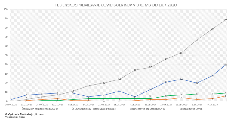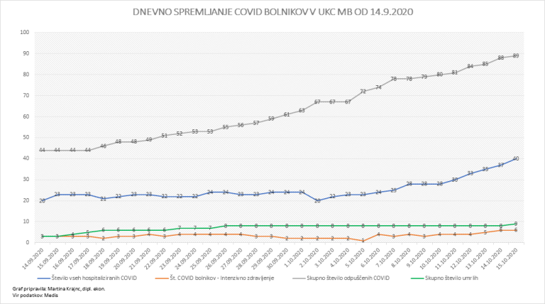 Stanje covid bolnikov v Univerzitetnem kliničnem centru Maribor za obdobje od 14. septembra do 15. oktobra 2020 in tedenski prikaz stanja za obdobje od 10. julija do 9. oktobra 2020 je prikazano v grafih.