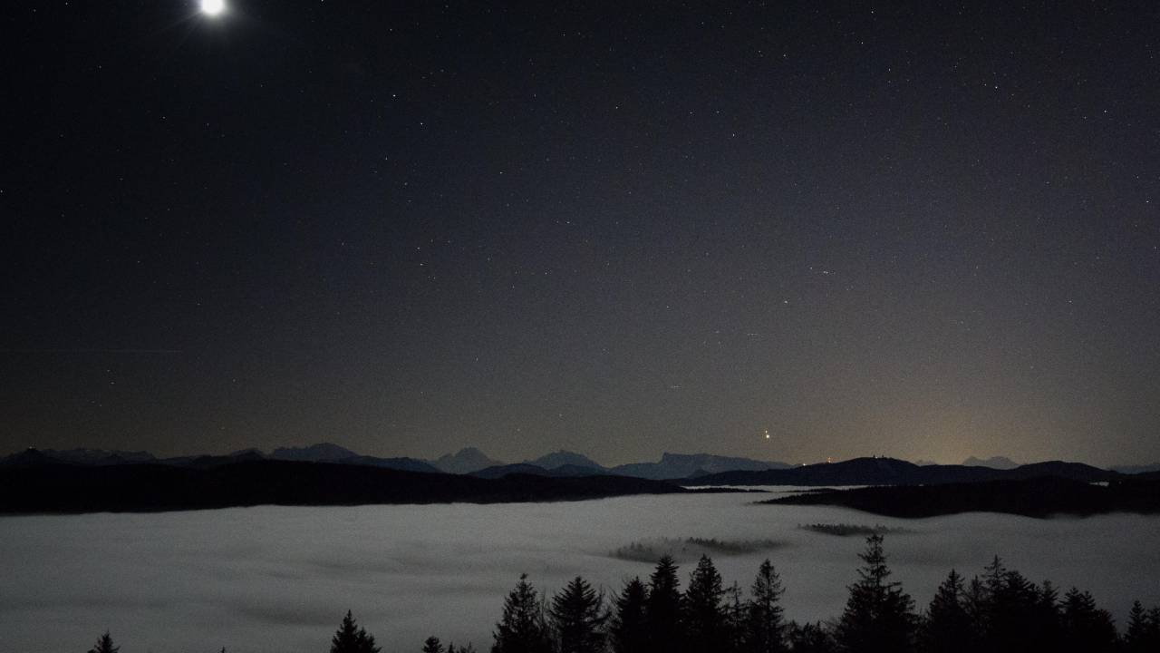Pri fotografiji je na vrhu Jupiter, na sredi Luna, desno spodaj pa Venera.