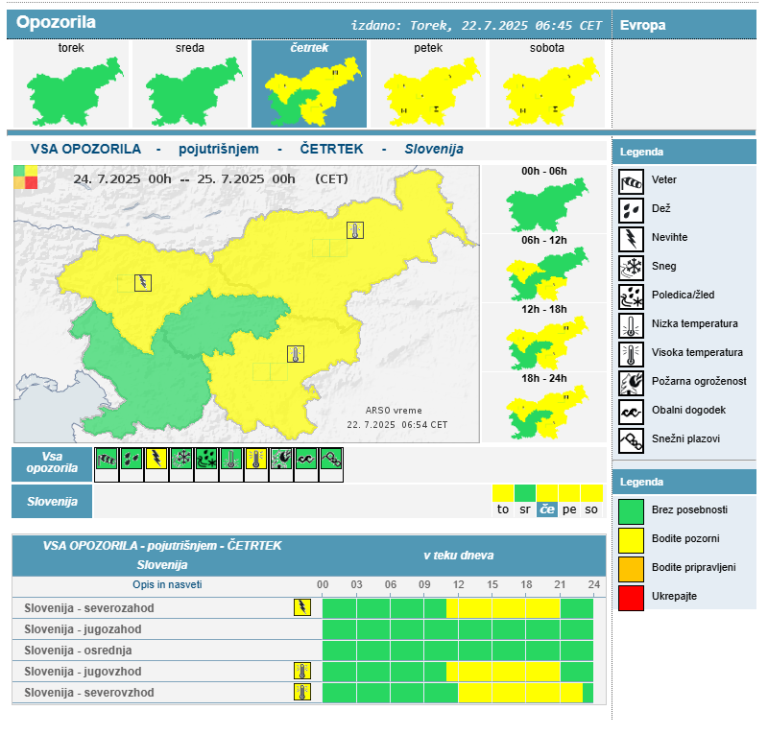 V sredo bo na Primorskem sončno, drugod bo delno jasno z občasno zmerno oblačnostjo. Popoldne bo v gorskem svetu možna kakšna ploha. Najnižje jutranje temperature bodo od 14 do 19, najvišje dnevne od 24 do 30, na Primorskem do 32 stopinj Celzija.