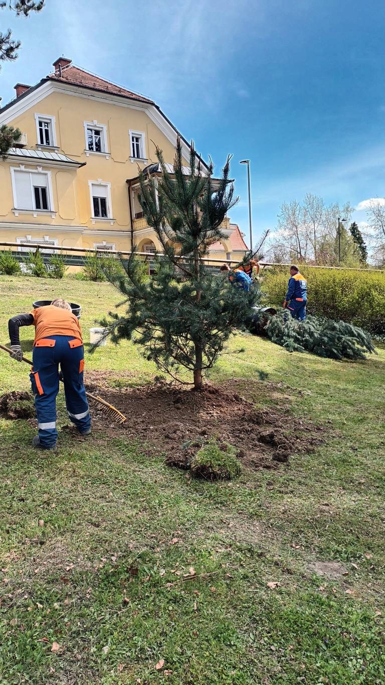 Sodelavci podjetja Nigrad so že posadili prvih 19 mladih iglavcev od skupno 67 mladih dreves, ki bodo nadomestila lani odstranjene smreke.