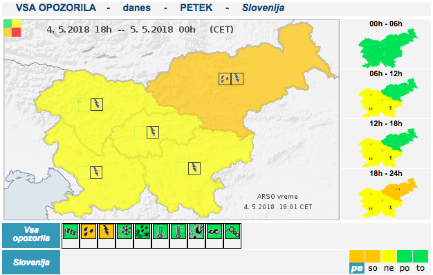 Na Štajerskem in v Pomurju bodo zvečer in v prvem delu noči nastajale nevihte z močnejšimi nalivi, ki lahko vztrajajo dalj časa, opozarjajo vremenoslovci. Predvsem zvečer ni izključen tudi pojav toče. Ob tem lahko narastejo hudourniški vodotoki, opozarja Agencija Republike Slovenije za okolje.