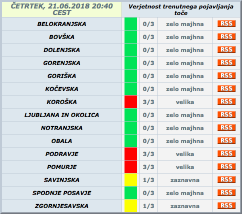 Zvečer bo predvsem na severu in severovzhodu države možnost močnejših padavin. Izključena ni niti toča, za Koroško so vremenoslovci že okoli 18.30 izdali rdeč alarm, zdaj še za Pomurje in Podravje.