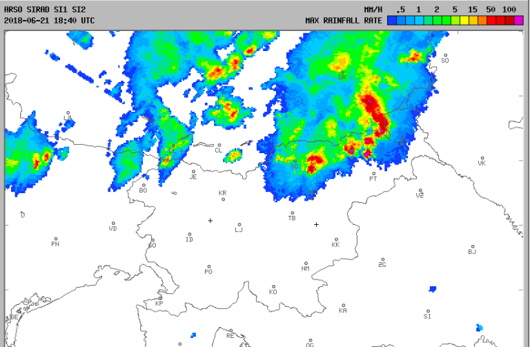 Agencija Republike Slovenije za okolje je že okoli 18.30 izdala rdeč alarm za verjetnost trenutnega pojavljanja toče na Koroškem, kot je razvidno iz radarske slike pa so se nevihtni oblaki iz smeri Avstrije premaknili tudi nad Štajersko in Pomurje.