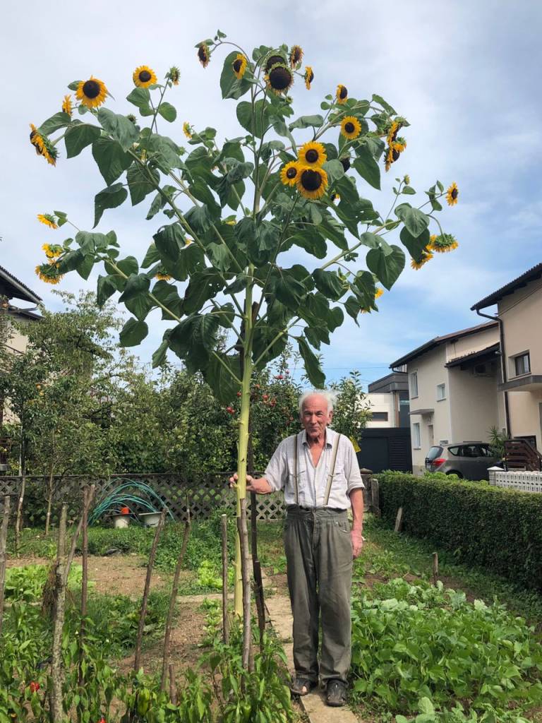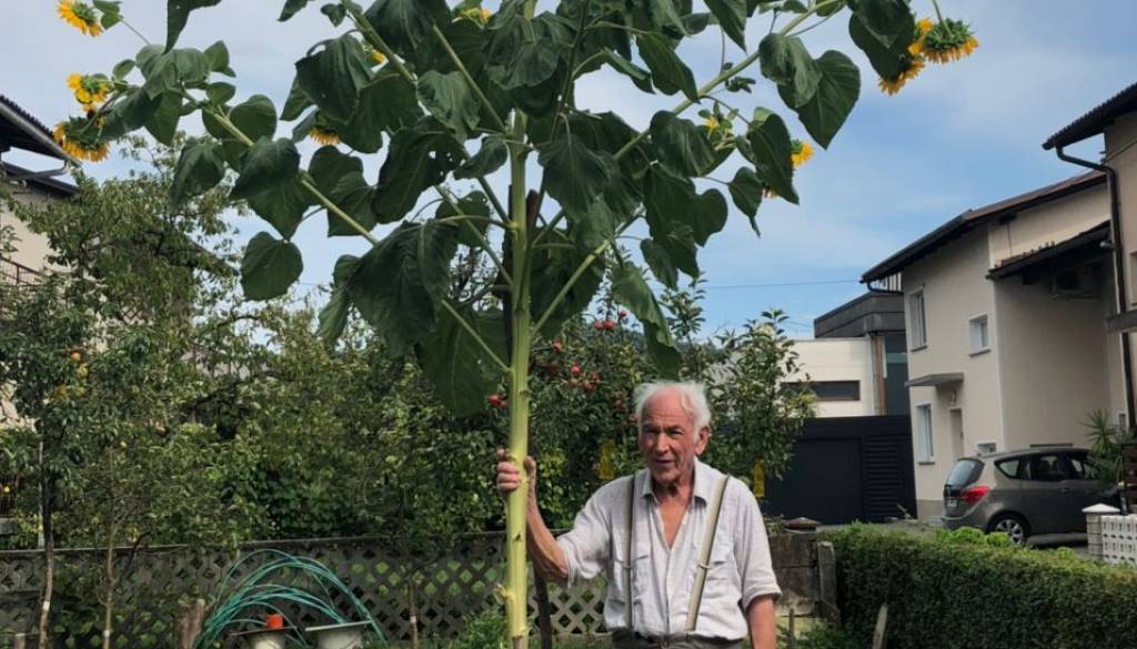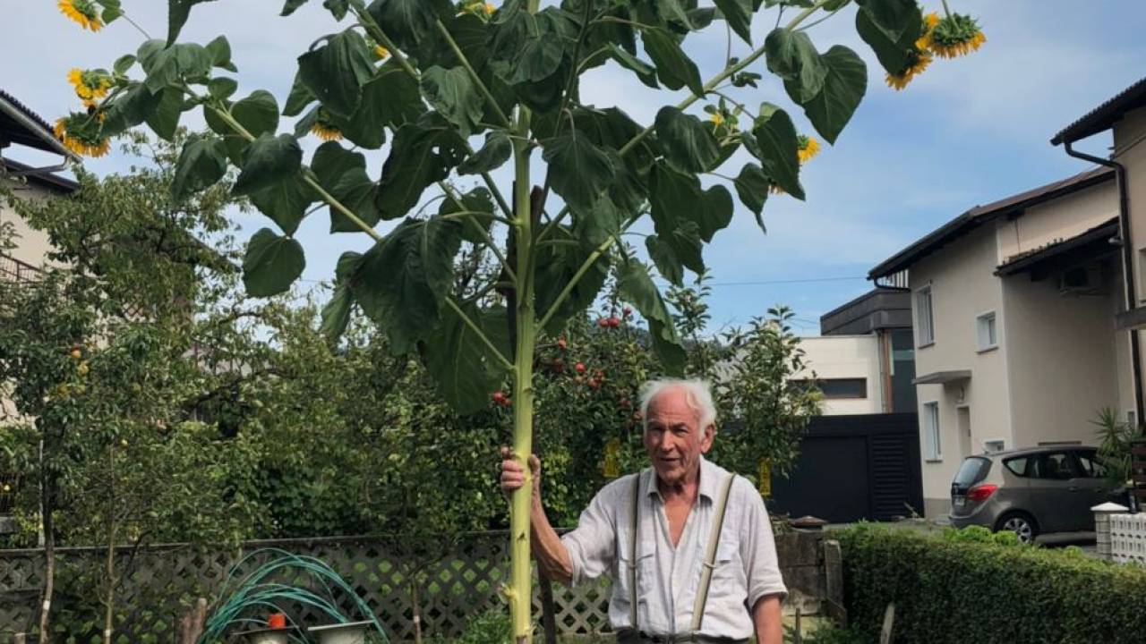 Če mislite, da je to fotomontaža, ste se zmotili! V ljubljanskih Vevčah je Viktorju Županiču zrasla skoraj štiri metre visoka sončnica in za kar en meter prerasla povprečno višino teh enoletnic.