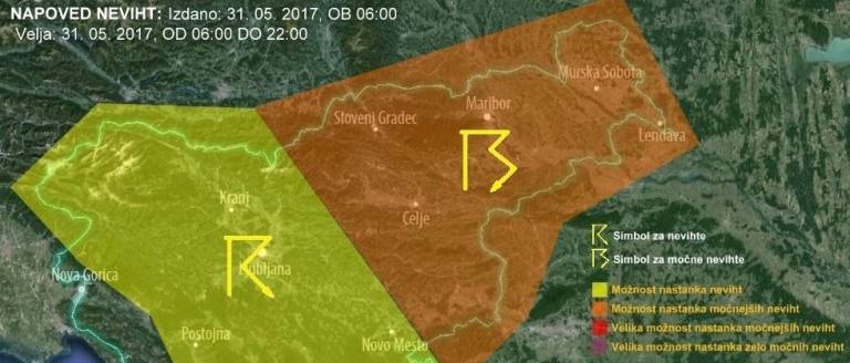 Nevihte, pobarvane z oranžno, kot je vidno na sliki, naj ne bi povzročile večje materialne škode, zanje je značilna tudi toča od enega do treh centimetrov premera.
