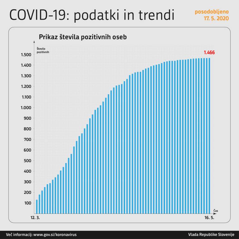 Včeraj, 16. maja, so v Sloveniji opravili 511 testov za covid-19, eden od njih pa je bil pozitiven. Skupno število okuženih je tako po novem 1.466.